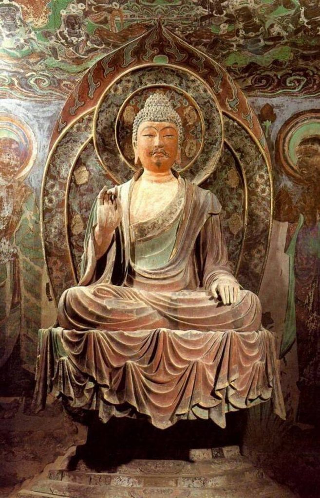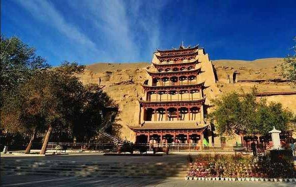 หลังจากรับประทานอาหารเช้าที่โรงแรมแล้ว ก็นั่งรถบัสต่อไปยังเมืองตุนหวง โอเอซีสกลางทะเลทรายโกบี ตั้งอยู่ในเขตเมืองจิ๋วเฉวียน (เดิมชื่อซูโจว) มณฑลกานซู่ เป็นเมืองอยู่บนทางสายไหมที่คาราวาน จะแวะมาพักผ่อนอิริยาบถ มีที่เที่ยวหลายแห่ง เมืองตุนหวง (Dunhuang) คำว่า ตุน แปลว่า ใหญ่ หวง แปลว่า รุ่งโรจน์ ดังนั้นเมืองตุนหวงได้ชื่อนี้เนื่องจากเป็นเมืองใหญ่ที่รุ่งโรจน์ในประวัติศาสตร์จีน ใครมาทางสายไหมต้องแวะเป็นเมืองโบราณมากว่า 2,000 ปี จุดสำคัญบนทางสายไหมที่จากจีนไปเอเซียกลาง ยุโรป และแอฟริกาเหนือ ตุนหวงเคยเป็นแหล่งบรรจบของอารยธรรมจีน อินเดีย กรีซ และอาหรับ เคยเป็นแหล่งบรรจบของศาสนาพุทธ อิสลาม คริสต์ เต๋า ยูดาร์ ฮินดู และเป็นแหล่งบรรจบของวัฒนธรรมชาติต่างๆ อีกกว่า 10 ชาติพันธุ์ ตุนหวงขึ้นชื่อด้วยถ้ำหินที่เจาะบนหน้าผาในช่วงศตวรรษที่ 4 – 14 ตลอดมาเป็นเวลาถึง 1,000 ปี เวลานั้นตุนหวงเป็นศูนย์กลางเศรษฐกิจ การค้าและวัฒนธรรมบนทางสายไหมเป็นสถานที่แห่งแรกของจีนที่ได้สัมผ้สเข้าถึงพุทธศาสนาประกอบกับความแห้งแล้งอุณหภูมิที่ต่างกันมากระหว่างกลางวันและกลางคืนจึงมีการสร้างวัดในถ้ำไว้เป็นที่สักการะบูชาพระพุทธเจ้า หลวงพ่อเล่อจุนเป็นผู้ริเริ่มสร้างถ้ำแห่งแรกในตุนหวงปีคศ. 366 หลวงพ่อพบเห็นแสงสีทองบนเนินทรายหมิงซาในตุนหวงราวกับว่าพระพุทธเจ้าหลายพันองค์ปรากฏจึงคิดว่าแถวนี้ศักดิ์สิทธิ์ จึงชี้นำให้ขุดถ้ำเป็นสถานที่ปฏิบัติธรรมของสงฆ์ ต่อมาตุนหวงได้ขุดถ้ำพุทธศิลป์เพิ่มขึ้นเรื่อยๆ ถึงศตวรรษที่ 7 ราชวงค์ถัง ตุนหวงก็มีถ้ำพุทธศิลป์มากกว่า 1,000 ถ้ำ ปัจจุบันถ้ำหินเหลือ 812 ถ้ำเรียงรายบนหน้าผาที่มีความยาว 1,600เมตร ถ้ำเหล่านี้สร้างเป็น2-3ชั้น บางทีมี 4 ชั้นมองไกลๆ เหมือนรังผี้ง ในถ้ำรวบรวมสถาปัตยกรรม ประติมากรรมและจิตรกรรมฝาผนังให้เป็นอันหนึ่งอันเดียวกัน