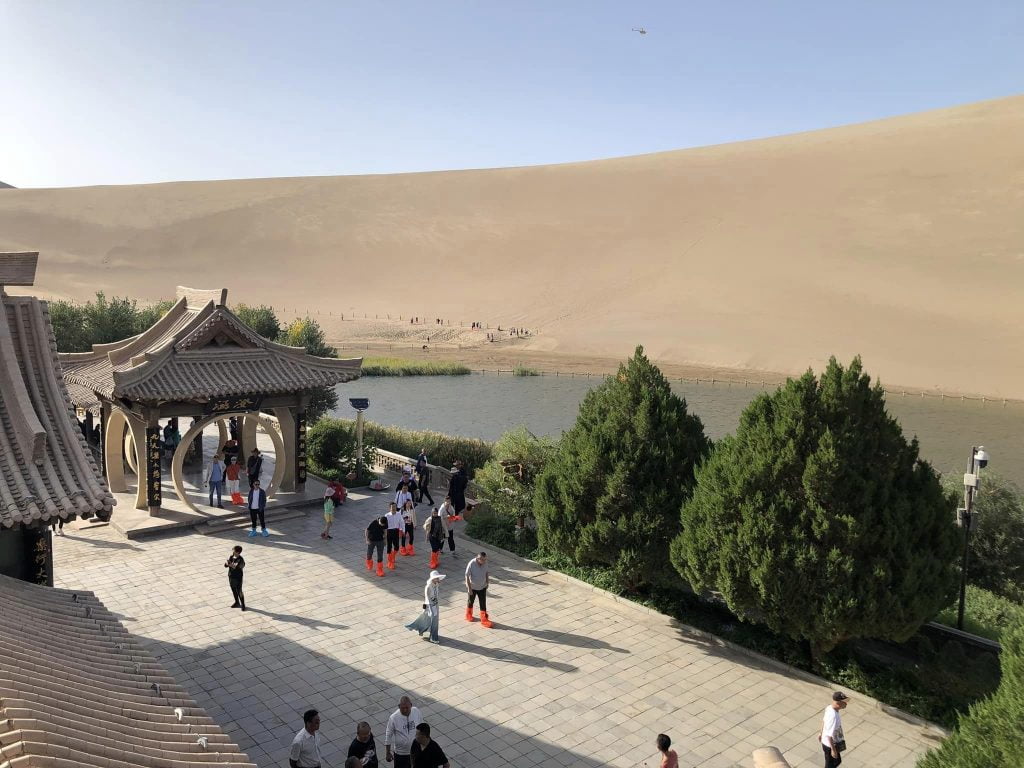 เดินไปอีกไม่ไกลก็ถึงทะเลสาบพระจันทร์เสี้ยว (เย่ว์หยาเฉวียน) ซี่งเป็นทะเลสาบเล็กๆ รูปพระจันทร์เสี้ยวเป็นโอเอซิสกลางทะเลทรายโกบี ทะเลสาบน้ำจืดนี้ถูกล้อมรอบด้วยเนินทรายที่มีความยาว 600 เมตร กว้าง 50 เมตร ลึก 5 เมตร ทางทิศใต้เป็นที่ตั้งของวิหารเจ้าแม่กวนอิม ศาลพระเจ้ามังกร หอน้ำพุหยก รอบๆ ล้อมรอบด้วยต้นไป๋หลาง ทะเลสาบไม่เคยแห้งและถูกทับถมด้วยทรายเพราะทิศทางลมไม่เคยพัดทรายลงมามีแต่พัดขึ้นบนเสมอ ทำให้ทะเลสาบอยู่ได้