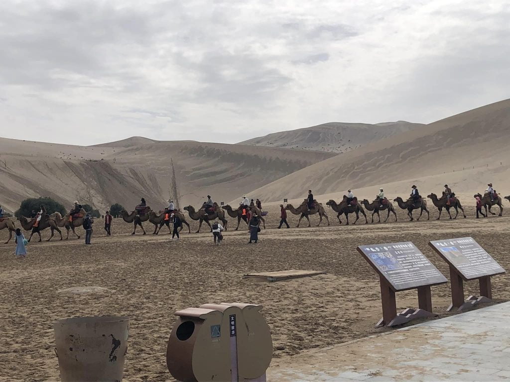 จุดหมายแรกของตุนหวง คือ เนินทรายหมิงซาซาน หรือเนินทรายร้องไห้ เนินทรายที่มีความยาว 40 กิโลเมตร สูงประมาณ 250 เมตร ทรายมีสีสันต่างกัน 5 สี คือ แดง เหลือง เขียว ขาว ดำ เมื่อถึงยอดเนินเขาสามารถไถลลื่นลงมาสู่เชิงเขาด้านล่างได้อย่างสนุกสนาน ขี่อูฐท่องทะเลทรายจูงตามกันเป็นแถวไปตามสันทรายที่โค้งไปมา เนินทรายดูเป็นประกายเมื่อต้องแสงอาทิตย์ตัดกับฟ้าสวยสีครามใส