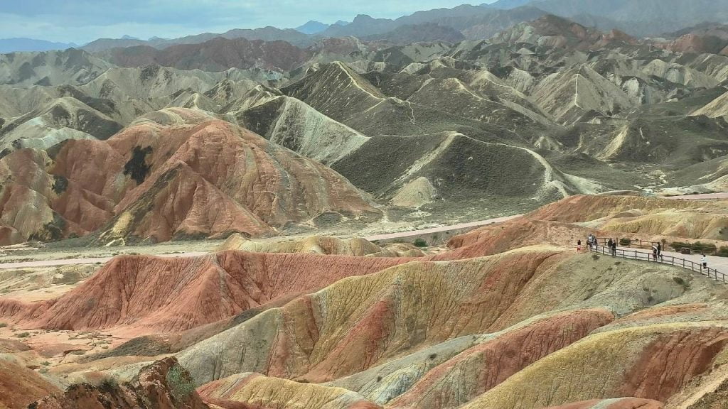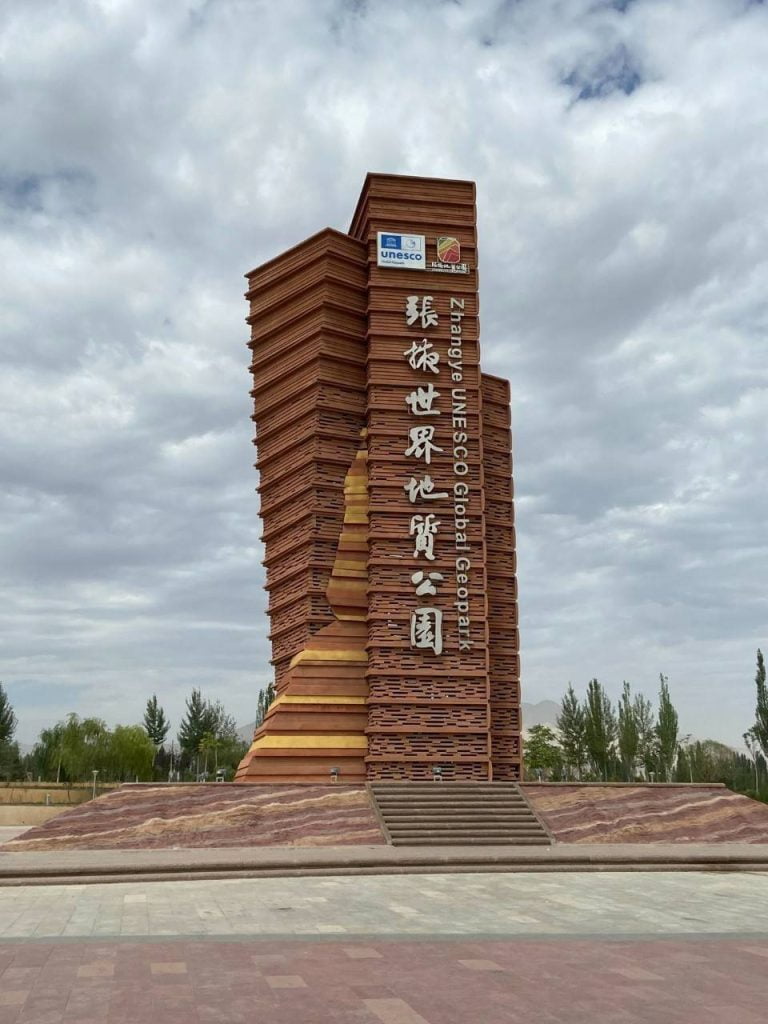 อุทยานแห่งนี้มีชื่อว่าอุทยานธรณีแห่งชาติจางเย่ตันเสียตี้จือกงหยวน หรือรู้จักกันว่าเขาสายรุ้งตันเสีย (Danxia Landform) เป็นแนวเขาที่มีลวดลายเป็นริ้ว ประกอบด้วยหินทรายและแร่ธาตุต่างๆ ที่เกิดจากการเคลื่อนตัวของเปลือกโลกเมื่อ 24 ล้านปีก่อน ลมและฝนใช้เวลานับพันๆ ปีกัดเซาะแนวเขาจนเกิดภูมิประเทศที่กว้างใหญ่ไพศาลมีสีสันต่างๆ สลับกันเป็นริ้วคล้ายรุ้งสุดแสนจะสวยงามอย่างมหัศจรรย์ จนได้รับการขึ้นทะเบียนเป็นมรดกโลกโดยยูเนสโกเมื่อค.ศ. 2010 ปีค.ศ. 2011 ได้รับแต่งตั้งเป็นอุทยานธรณีวิทยาแห่งชาติ ทุกวันนี้มีการสร้างทางและบันไดขึ้นเขาบางลูกที่มีความสวยงามมากหลายเขาเพื่อให้ขึ้นไปสัมผัสความงามได้สะดวก การเห็นตลอดเส้นทางเดินและนั่งรถอุทยานไปจุดต่างๆ นั้นว่าสวยแล้ว พอขึ้นไปแต่ละจุด นอกจากสวยตระการตาแล้ว ยังรู้สึกมหัศจรรย์ในความสวย ซับซ้อนของธรรมชาติ ตื่นตาตื่นใจ ลืมความเหนื่อยจากการเดินทางไกลสิ้นเชิง ริ้วเขาโทนสีแดงเป็นหลักสลับกับเหลืองอำพัน เขียวมรกต เป็นคลื่นภูเขาทรายดูดั่งสายรุ้งดุจมณีหลากชนิดทั่วพื้นที่กว้างใหญ่ไพศาล แทบลืมหายใจ ไม่เชื่อว่าอยู่ในความฝัน แต่ช่วงที่มาไม่สวยมาก เดือนที่เขาสวยสุดสีสันเข้มจะอยู่ที่เดือนมิถุนายน